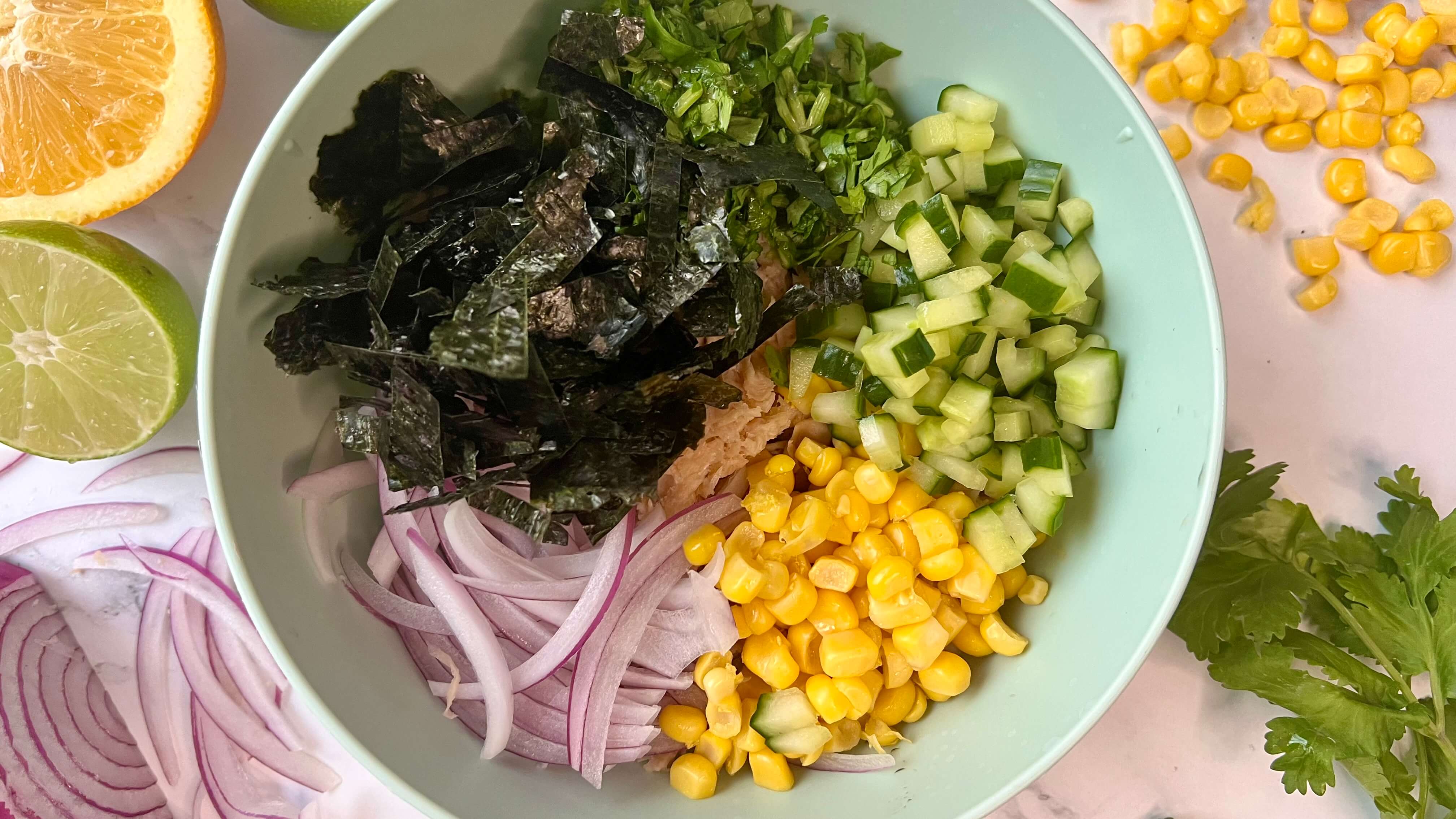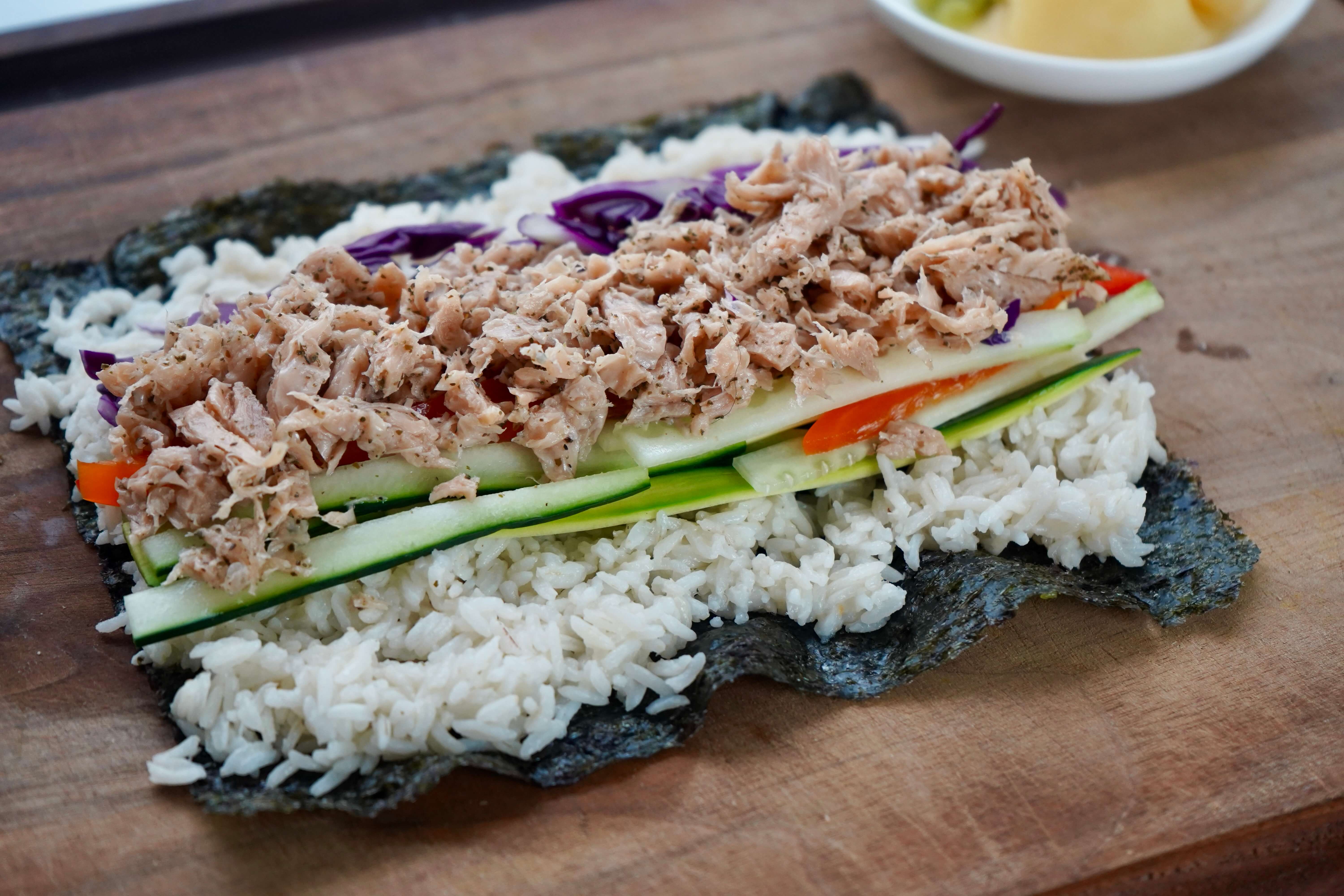 - Arrange a line of avocado slices, cucumber strips, and the seasoned plant-based shreds in the center of the rice.