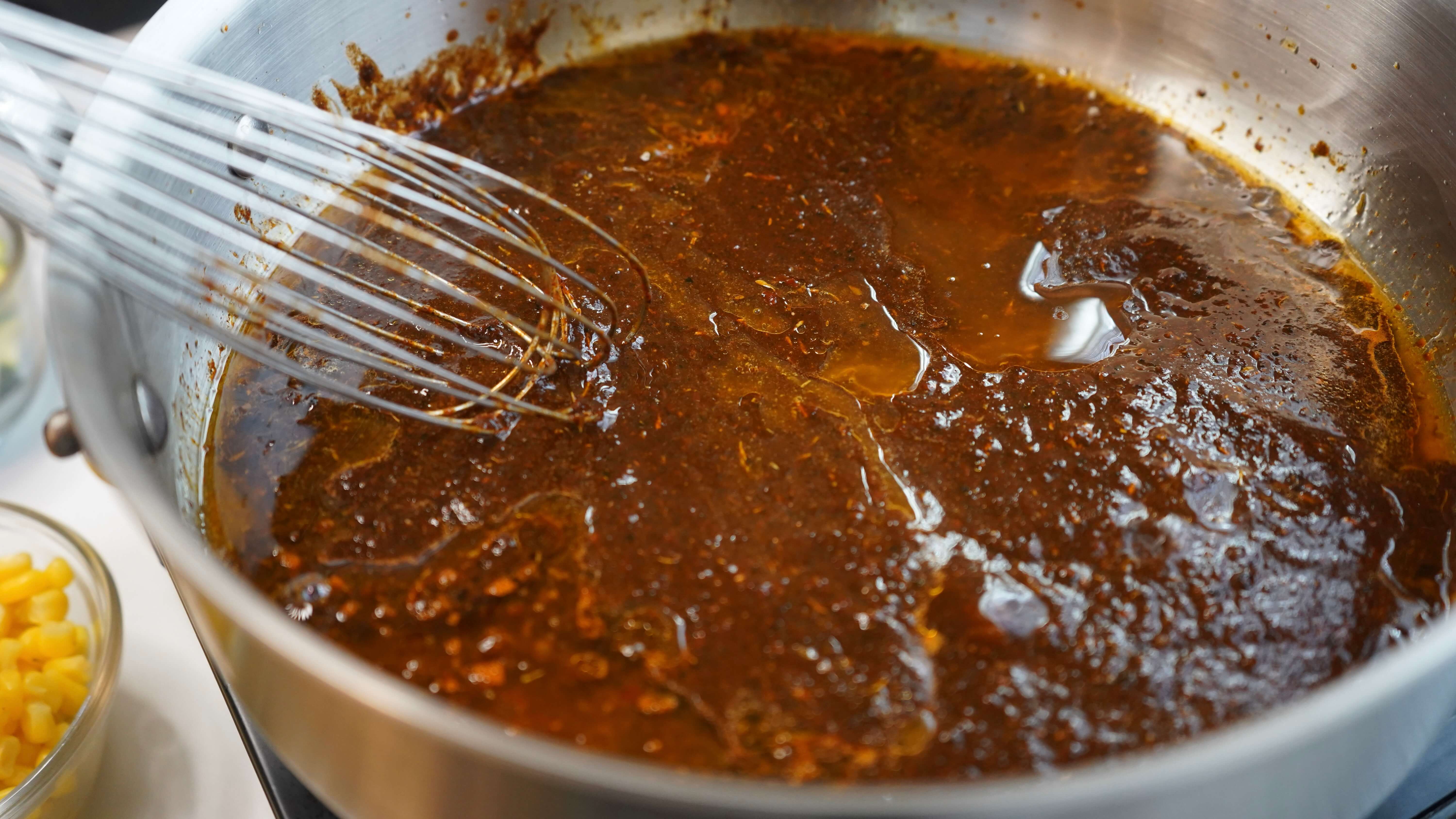 - While the plant-based meat cooks, prepare your sauce by combining the soy sauce, brown sugar, mirin, sesame oil, gochujang and lime juice in a medium bowl until the sugar has dissolved and all ingredients are combined.
