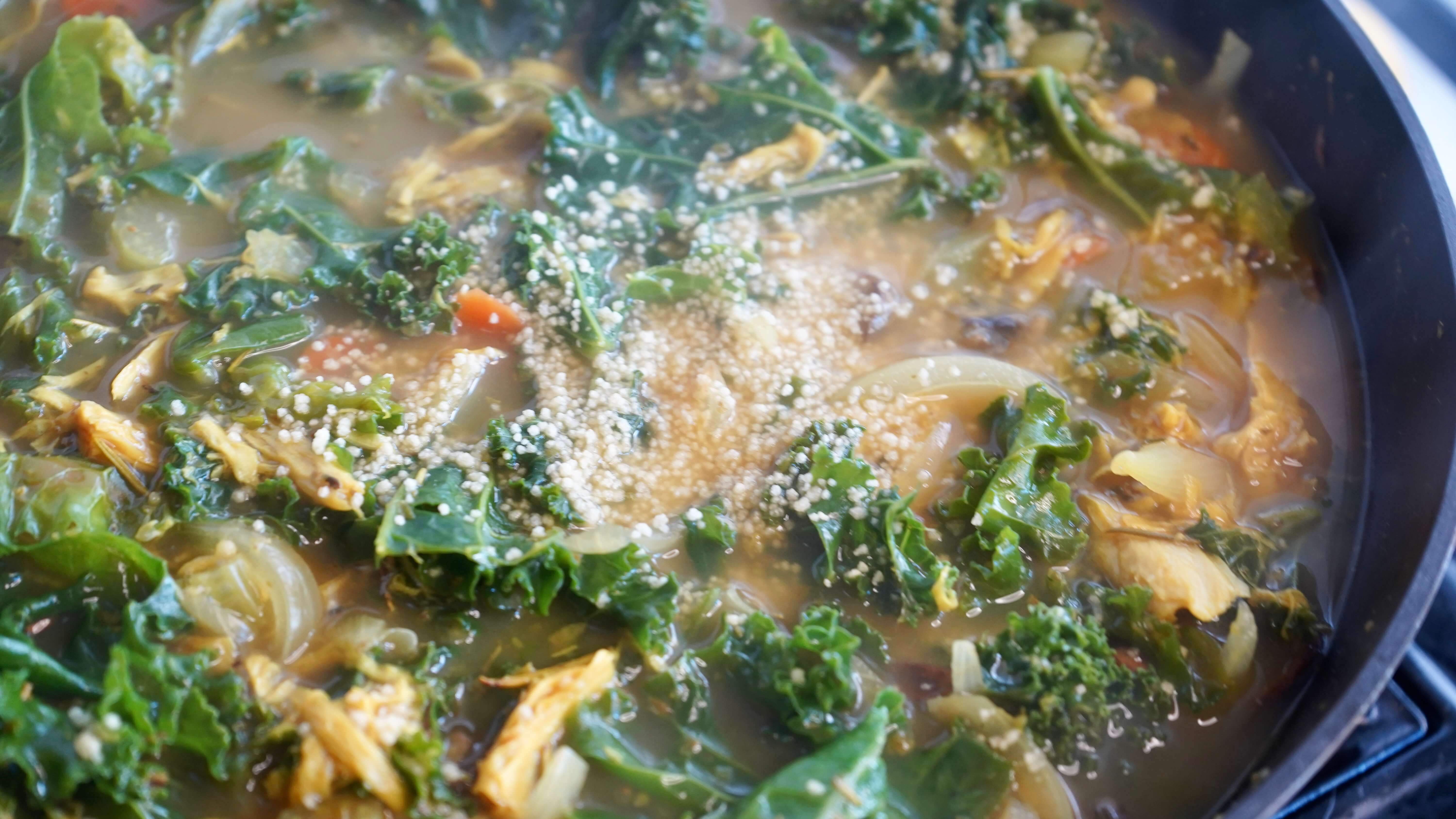 Lemon Kale and Plant-Based "Chicken" Soup with Cous Cous